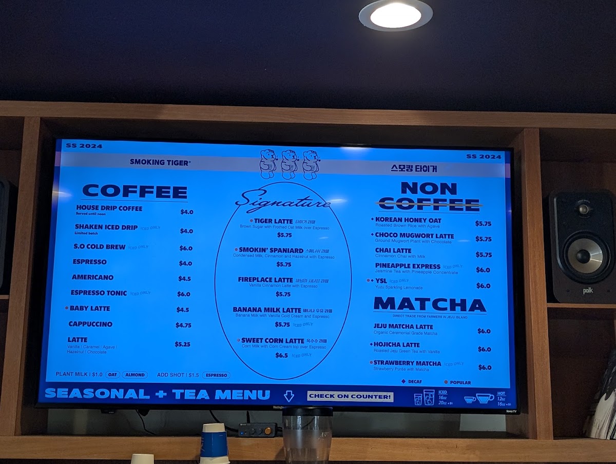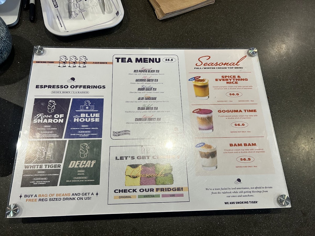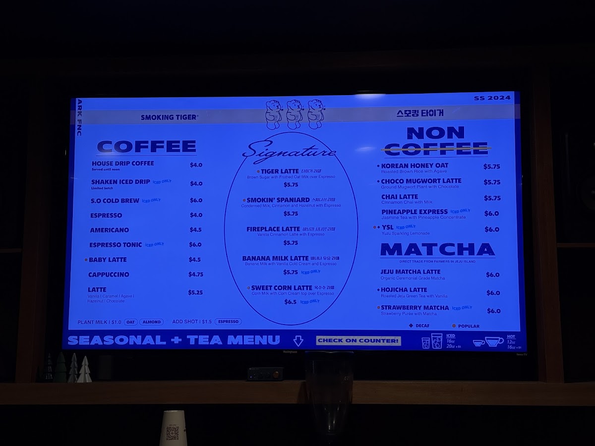 - Signature Drinks: Includes unique coffee creations such as the Smokin' Spaniard (a Spanish latte with condensed milk, hazelnut, and cinnamon), Banana Milk Latte served iced with vanilla cold foam, and the Tiger Latte combining espresso with brown sugar, caramel, and oat milk.