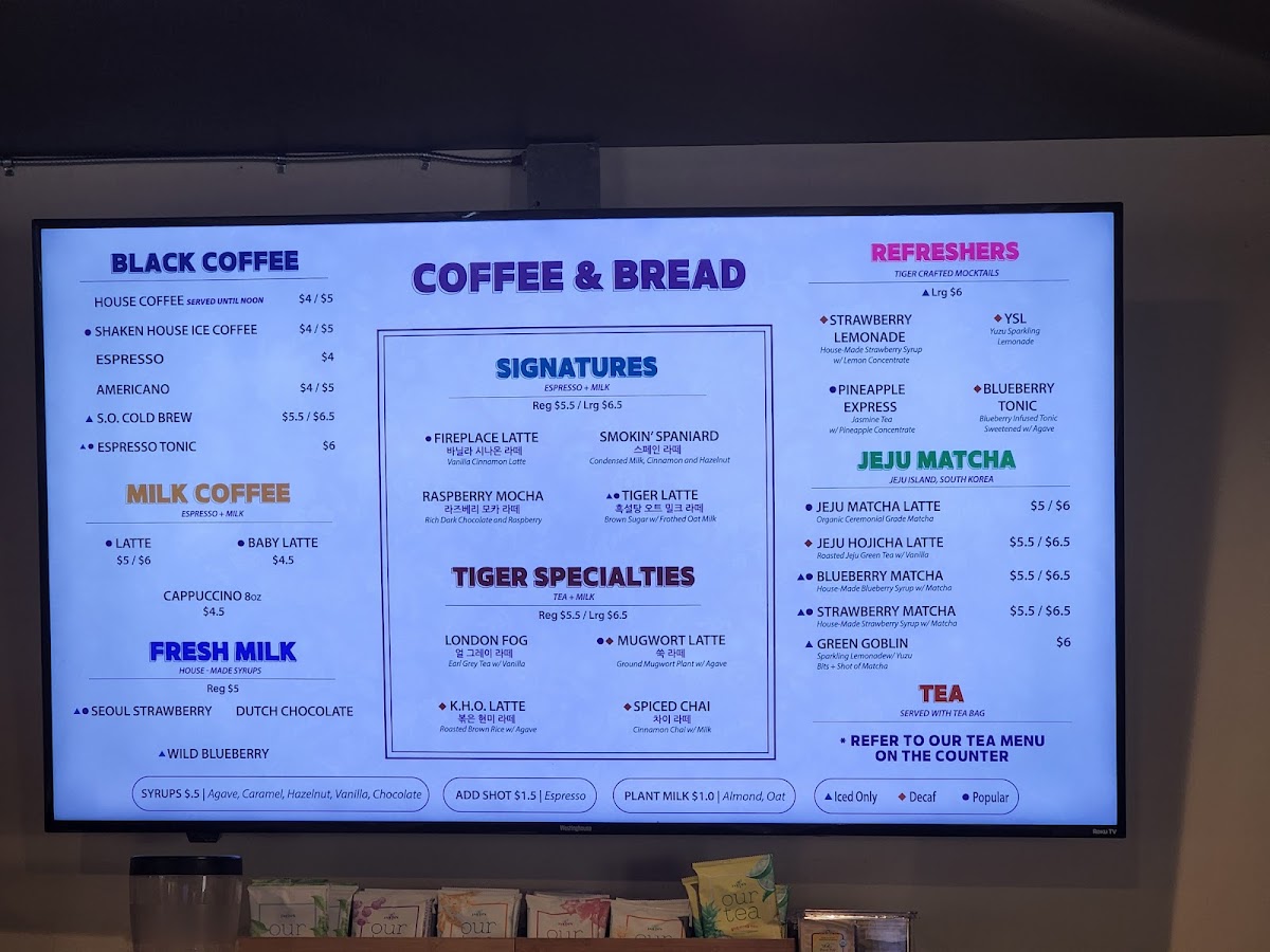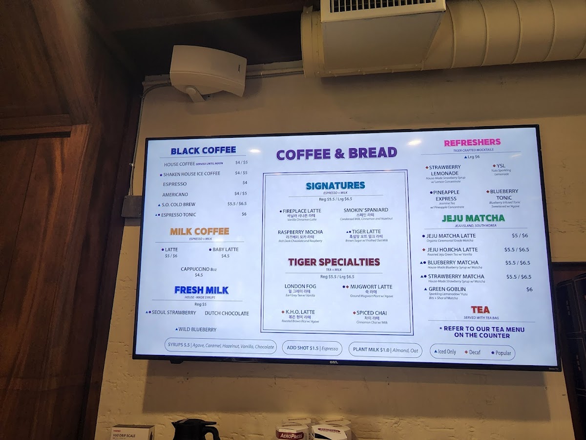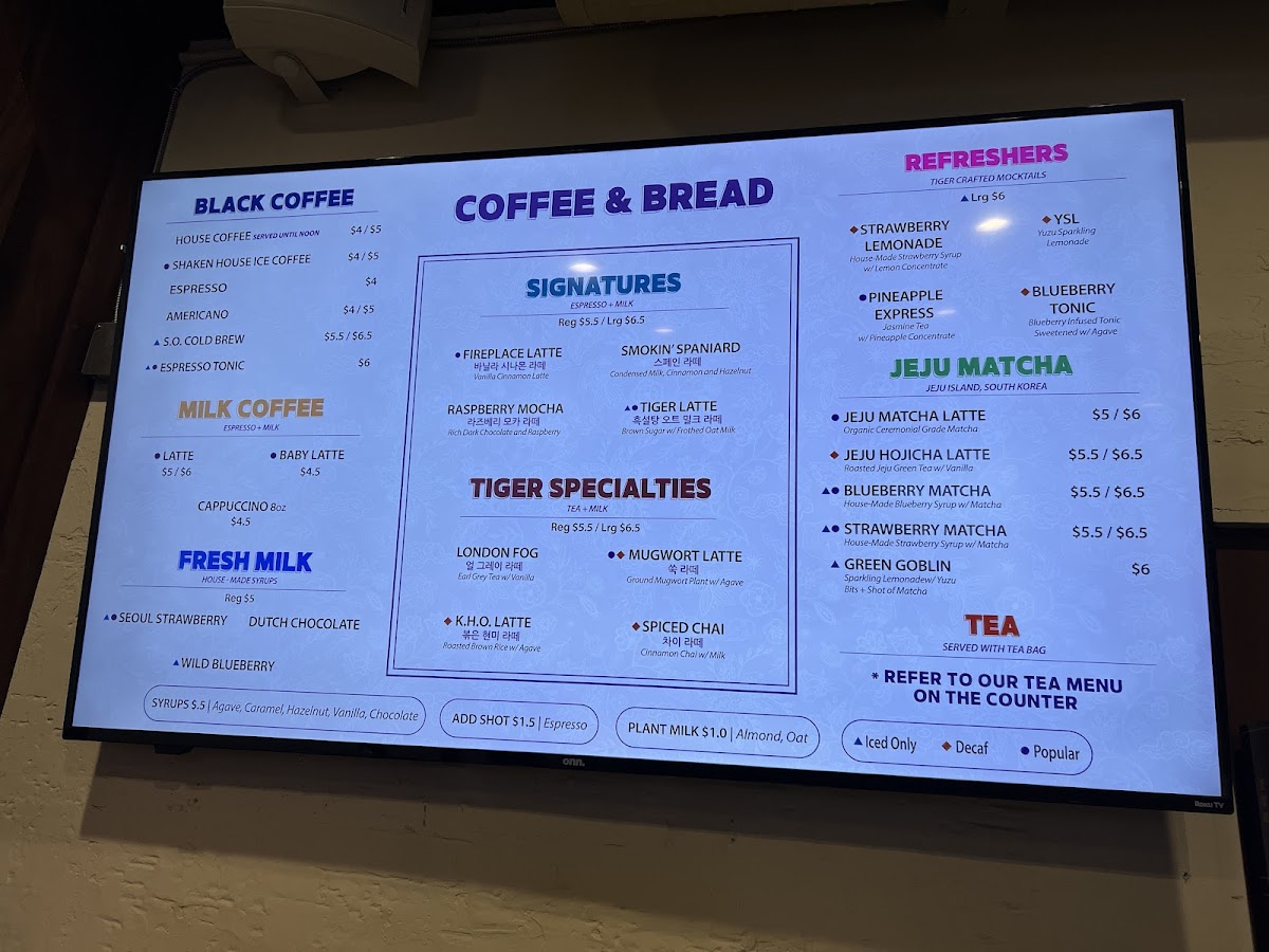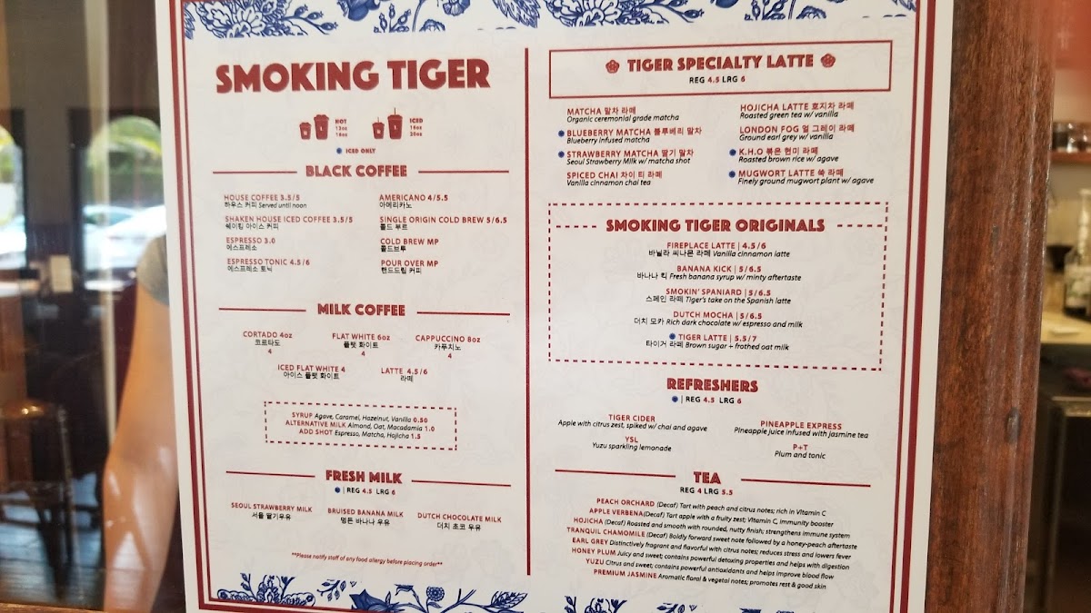 The menu at Smoking Tiger Coffee & Bread features a variety of coffee beverages, specialty lattes, and a selection of baked goods. The offerings are well-suited for breakfast, coffee breaks, or light meals throughout the day.