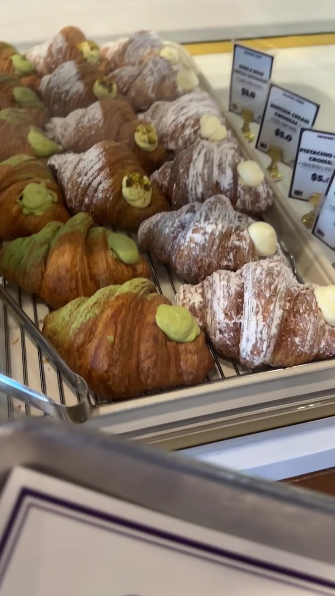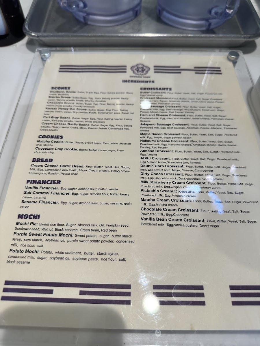 - Pastries and Breads: Various croissants including banana, ham and cheese, bacon maple, and croissants with powdered sugar and cream. A notable item is the Garlic Sweet Potato Bread and Banana Bread.